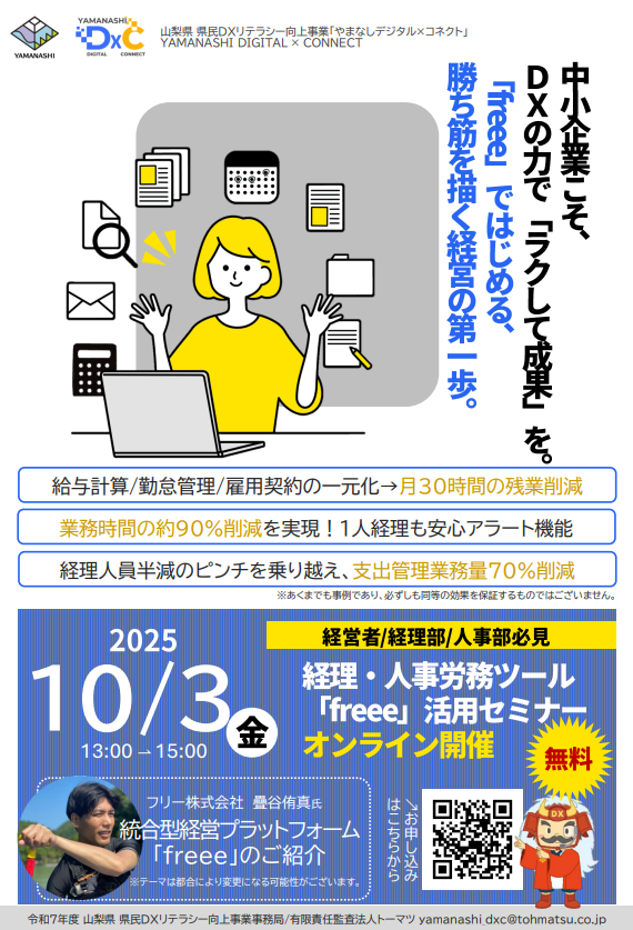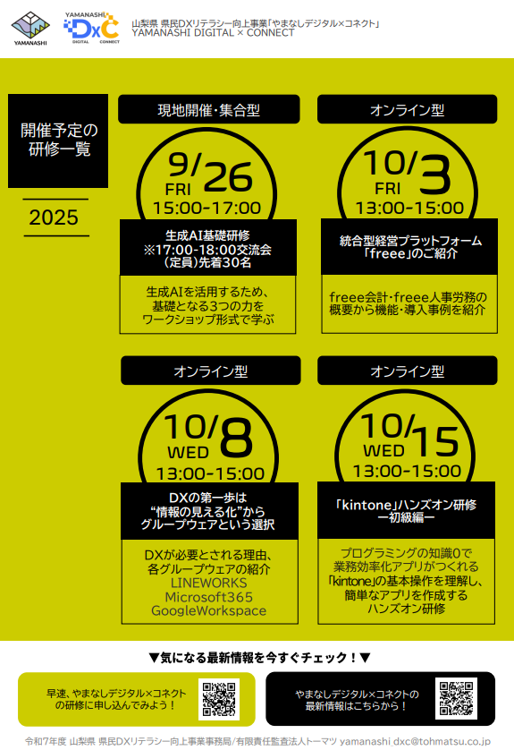 「やまなしデジタル×コネクト」10月研修プログラムドットワークPlus Labを拠点に、オンライン配信で開催します。各回とも無料でご参加いただけます。