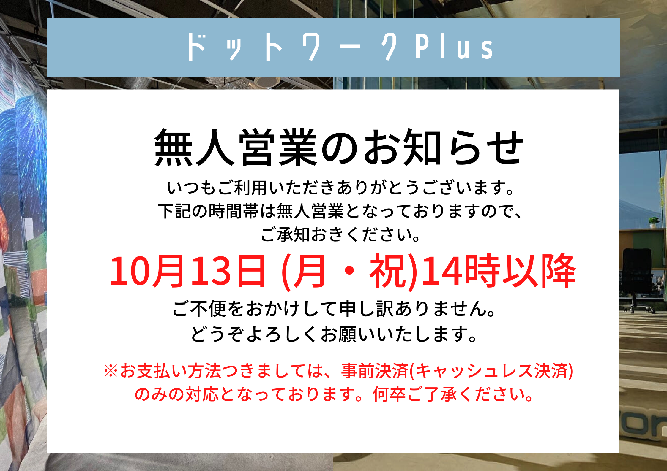 ※なお、お支払い方法につきましては、無人営業の時間帯に関しましては、事前決済(キャッシュレス決済)のみのご対応となっております。