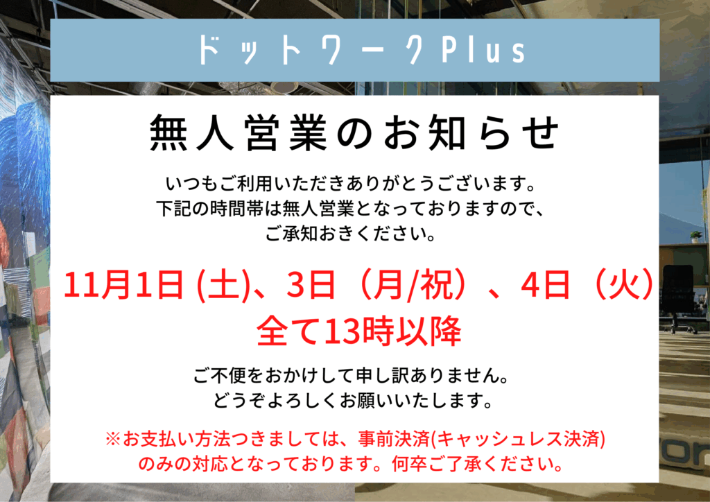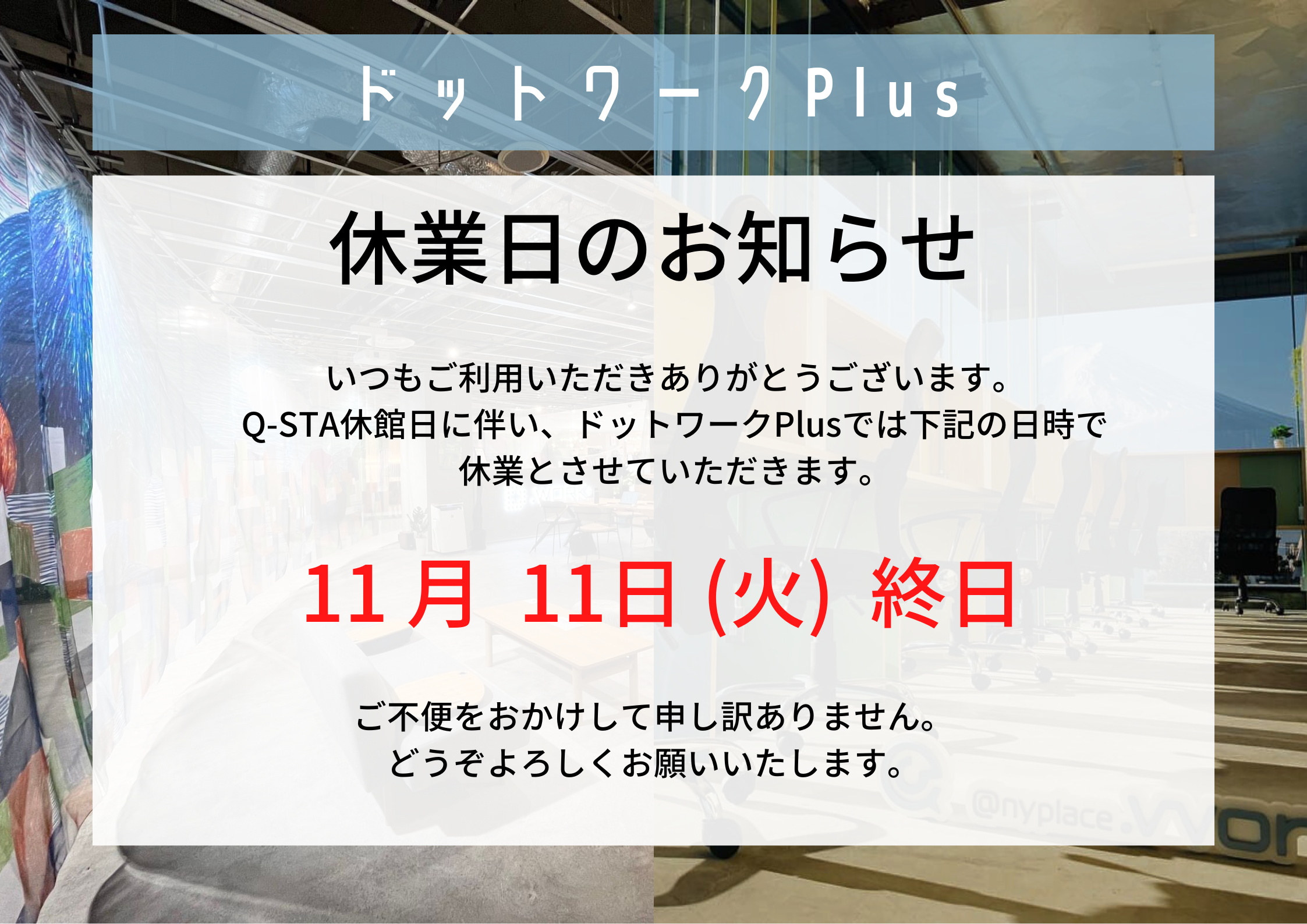 Q-STA休館日に伴い、ドットワークPlusでは下記の日時で休業とさせていただきます。